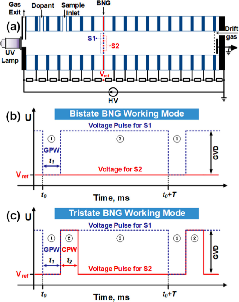 图1 (a) BNG-IMS 装置示意图;(b)双态模式下BNG门控电势波形;(c) 三态模式下BNG门控电势波形。