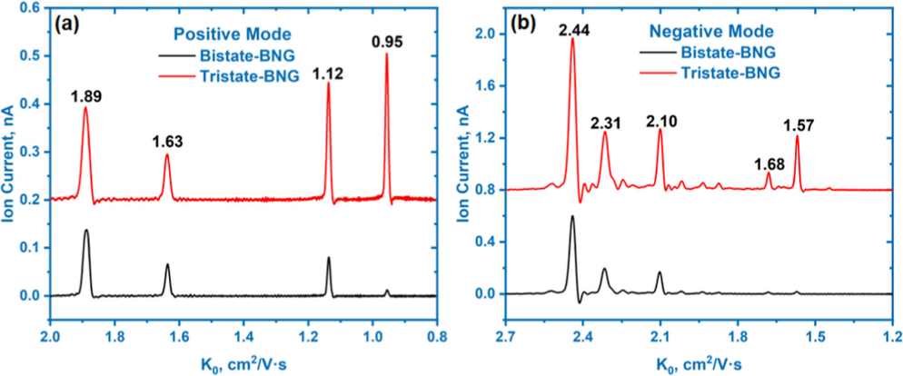 双态BNG工作模式下,增大GVD虽然可以提高分辨率,但会伴随严重的离子清空效应,导致低迁移率离子的灵敏度大幅下降。为了减少迁移率歧视效应,团队开发了三态BNG工作模式(图1c),在传统“开启-关闭”两状态间加入“压缩状态”,有效减少了高GVD下的离子清空区,让会聚的离子得以高效注入漂移区,同时保留了时间压缩效应带来的高分辨率。实验测试中,三态BNG模式相比于传统双态BNG模式展现出卓越性能(图4):正模式下(DEHP)H+的离子电流提高21.9倍,并保持96的分辨率;负模式下(MS·O2)−的离子电流提高26倍,分辨率达103。这一成果成功解决了传统模式中灵敏度与分辨率的矛盾,让不同迁移率的离子都能被高效检测,适用于其他使用BNG的IMS系统,从而提高复杂样品的分析性能。