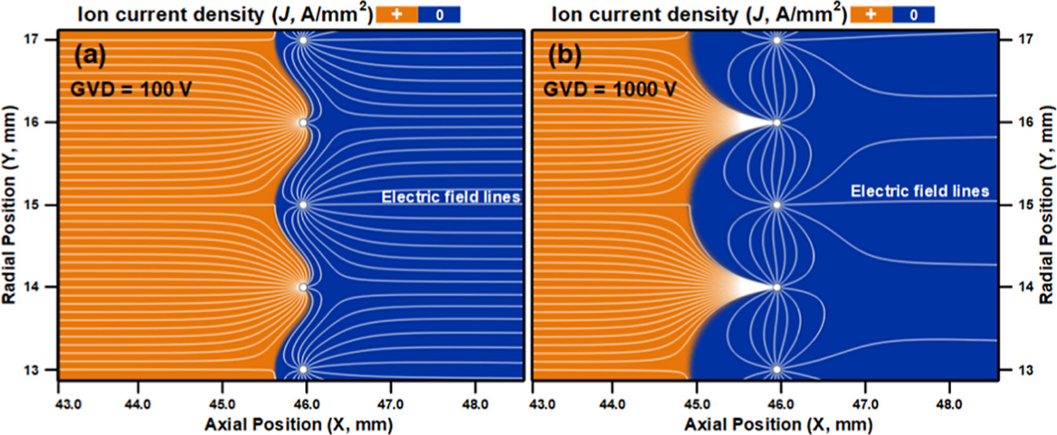图 3. (a) GVD=100 V和 (b)1000 V时离子电流密度(J)和电场线(白色)的分布